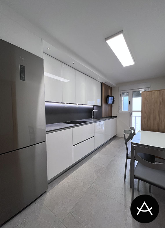 En la cocina tenemos todos los electrodomésticos, todos integrados excepto el combi, en el frente principal todo en blanco. De esta manera, ganamos amplitud y esa luz que nos hace falta.