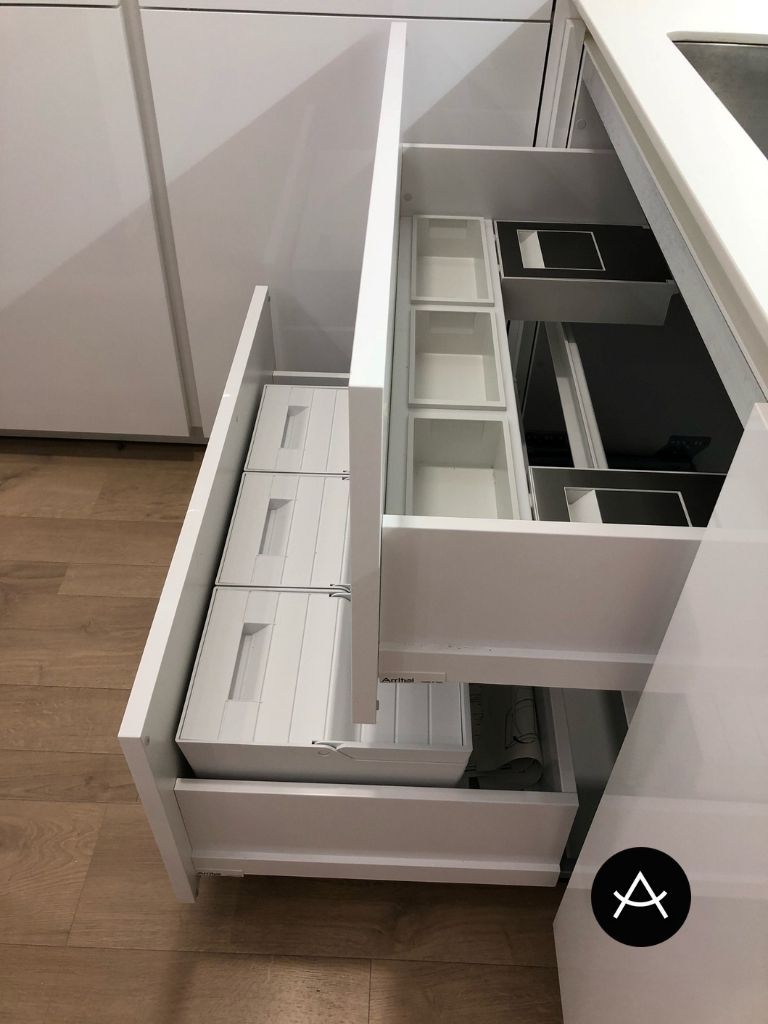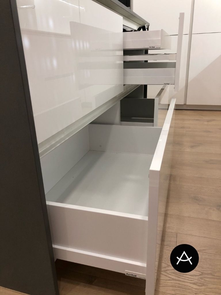 Debajo de la placa son todo gavetas y cajones para tener máximo servicio posible para cazuelas, sartenes y cubertería.