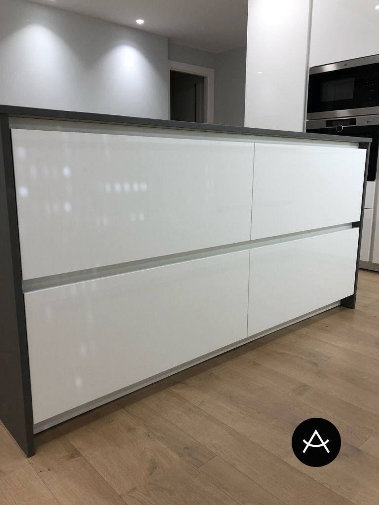 La isla está orientada hacia el salón para que la estancia sea más agradable. La encimera, LAMINAM PORCELANICO, tiene suficiente vuelo como para poder comer alrededor. Va en color negro para contrastar con el blanco brillo de los muebles. Combinada en blanco absoluto y galce antracita.