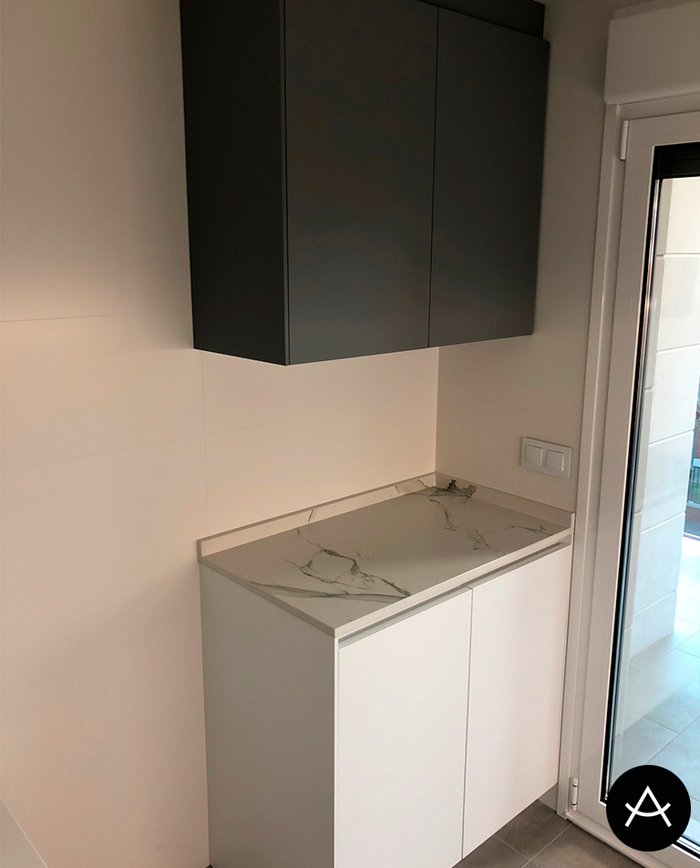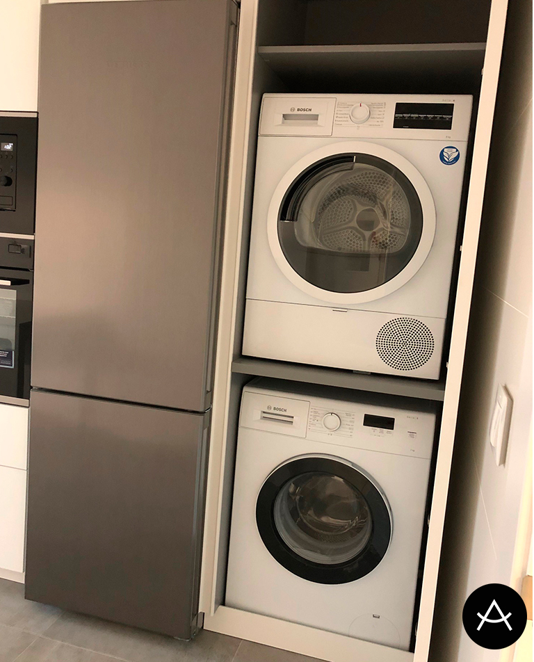 La zona de columnas está diseñada con 70 cms de fondo para ganar capacidad y poder ocultar la lavadora y la secadora.